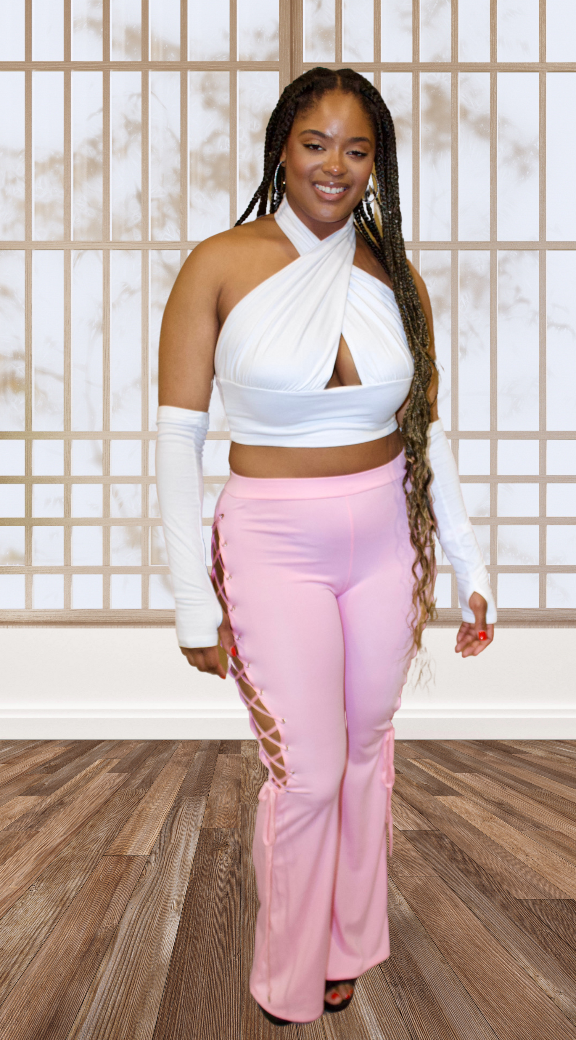 Backless halter top and matching sleeves with thumb hole. Can be worn 2 ways, as twisted neckline for maximum cleavage or crisscross neckline for a pop of cleavage.