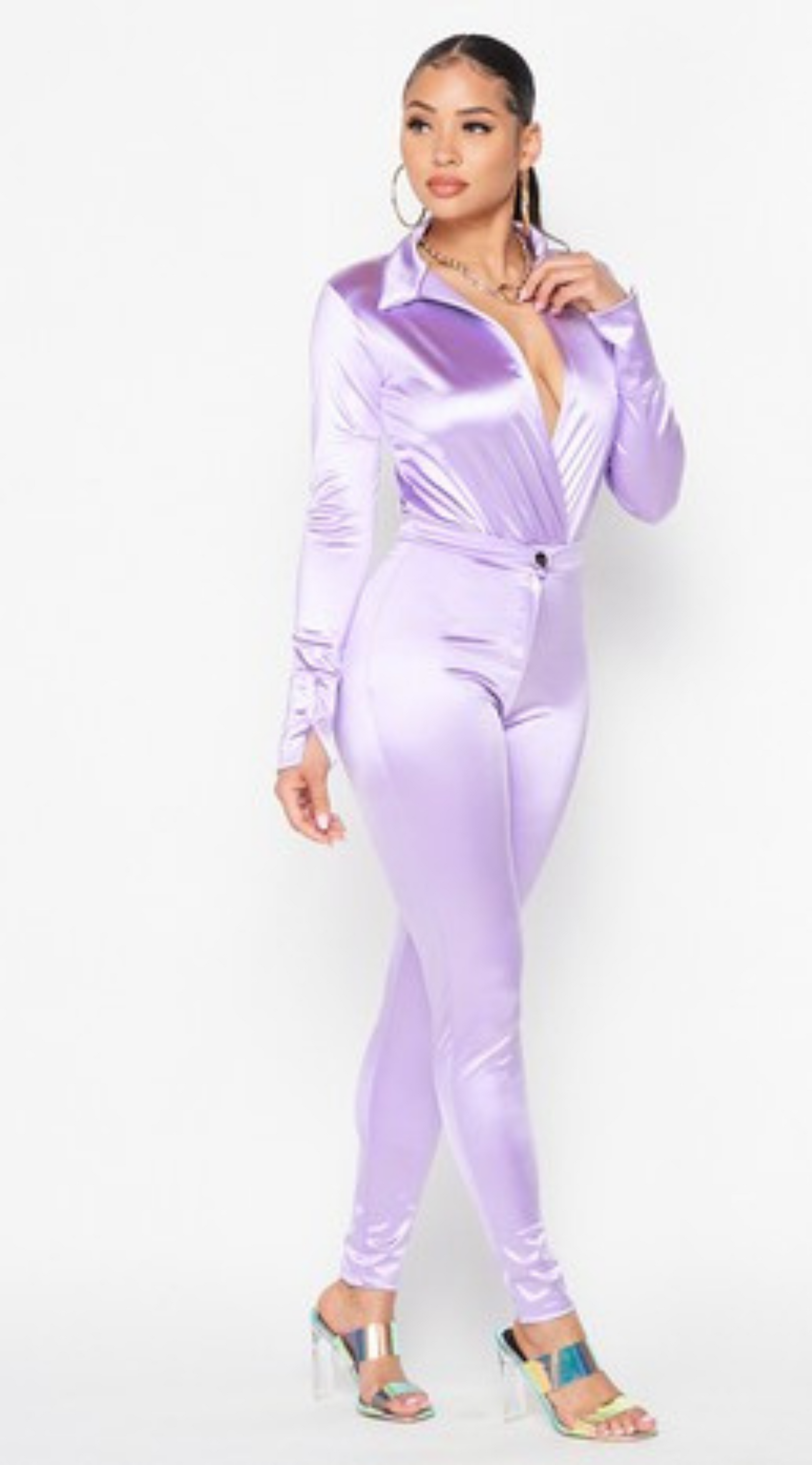 The Date Night Set is a stylish statement piece, that is sure to turn heads! This satin two-piece set comfortable and stylish. Its plunging neckline adds a touch a sexiness, and the luxurious satin fabric gives it a sophisticated sheen, making it perfect for date night, a night on the town, or a special occasion.